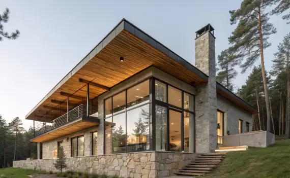 В коттеджном посёлке выполнено безрамное остекление угловой части дома с панорамным видом. Использована система Lumon с раздвижными и складывающимися секциями «книжка». Стекло – закалённое, толщиной 10 мм, без тонировки. Все крепления скрыты, швы обработаны герметиком. Остекление полностью интегрировано в архитектуру фасада. Срок выполнения работ — 7 дней.