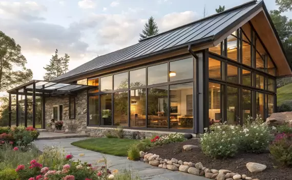 Для современного коттеджа с природной отделкой и панорамным видом на участок было выполнено тёплое остекление с использованием алюминиевой системы Reynaers CS 77. Окна высотой до 2,8 м и раздвижные двери с лёгкими рамами обеспечивают ощущение открытого пространства. В проект также включены фрамужные проветриватели, отливы, подоконники, профессиональный монтаж, доставка и вывоз мусора. Работы заняли 7 дней, проводились весной..
