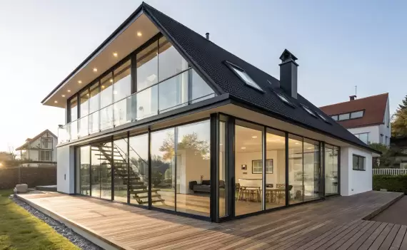 Двухэтажный дом с безрамным остеклением и теплыми стеклопакетами